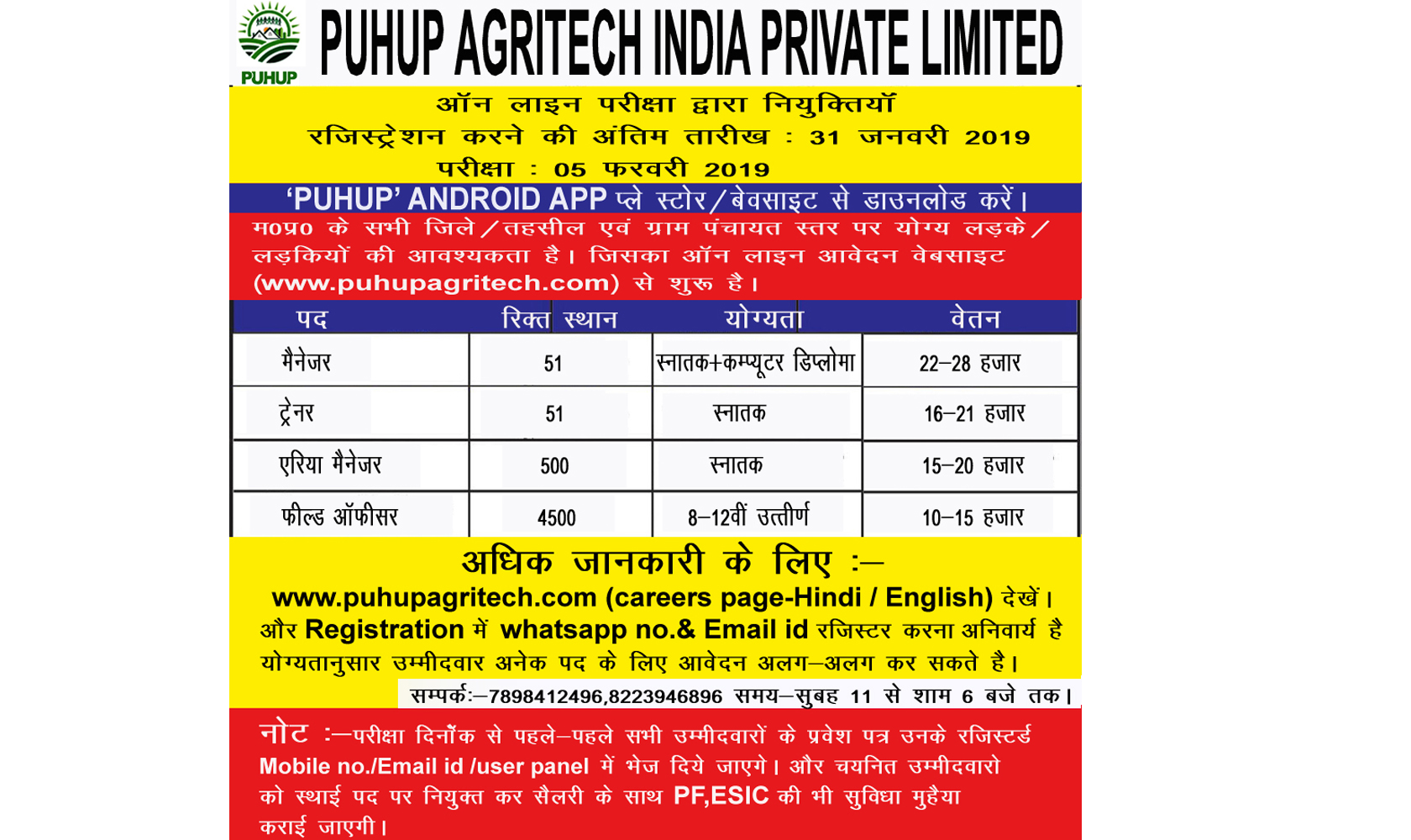 Puhup Agritech India Private Limited advertisements are featuring in the well-known and widely read newspapers in the state of Madhya Pradesh. All the basic and useful piece of information is given in the small advertisement which is enough for the candidates and for the detailed information, the website address is mentioned in the advertisement, so that the candidates gets the whole bunch of knowledge before registering for vacancies in the organization.