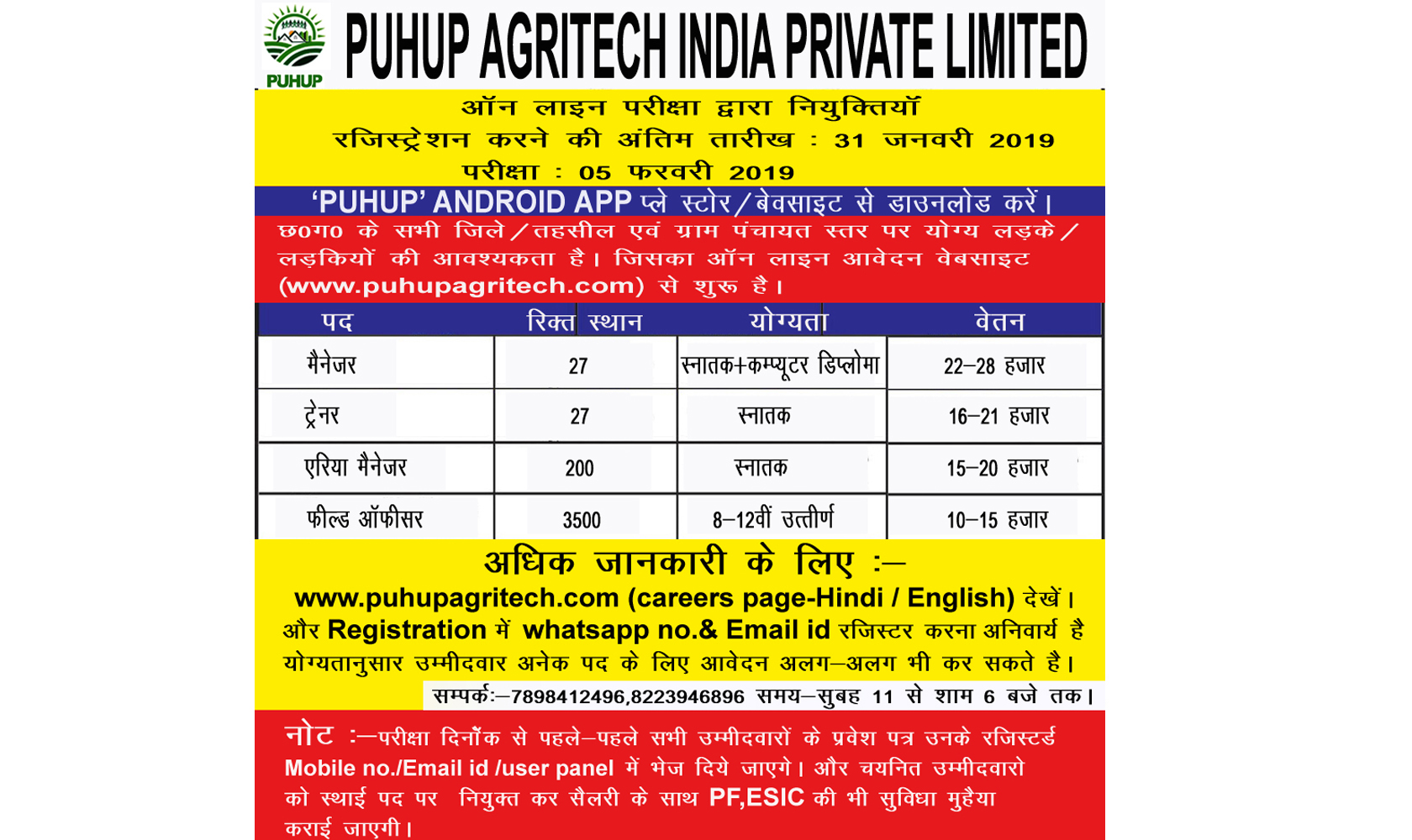 Puhup Agritech India Private Limited advertisements are featuring in the well-known and widely read newspapers in the state of Madhya Pradesh. All the basic and useful piece of information is given in the small advertisement which is enough for the candidates and for the detailed information, the website address is mentioned in the advertisement, so that the candidates gets the whole bunch of knowledge before registering for vacancies in the organization.
